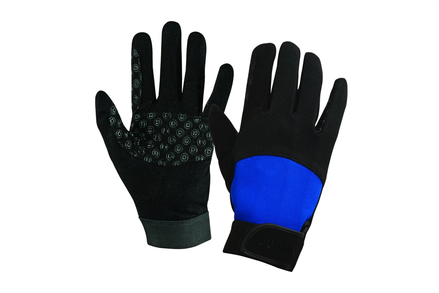 Dublin Cross Country Riding feature strategically placed D logo silicone print on the inner palm and fingers to provide grip where needed, elastic wrist and touch tape closure, neoprene on the back of the hand and stretch panels in the knuckles for additional stretch and comfort.