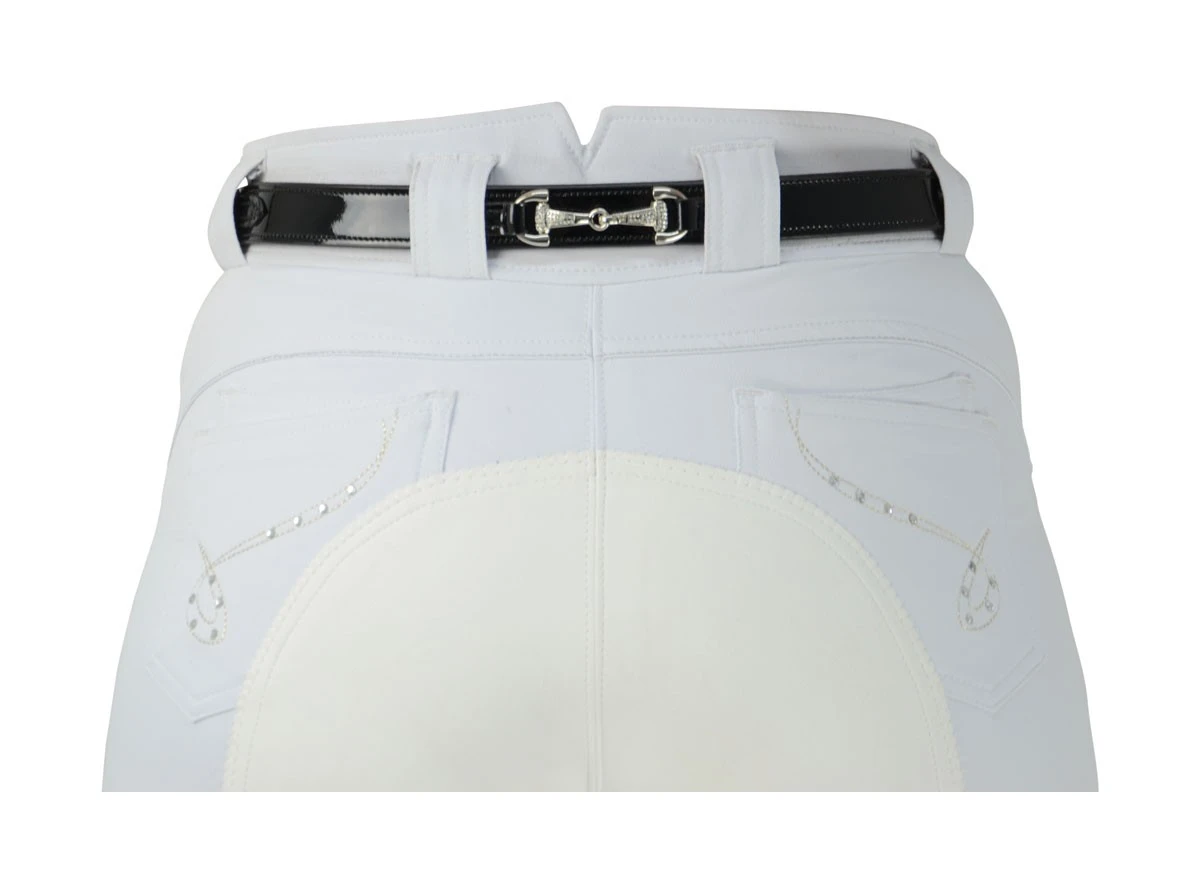 Patent leather belt with three crystal snaffle bits to add a hint of bling to a smart look. Ideal for wearing with white breeches for competition or for adding some extra sparkle to a casual outfit.